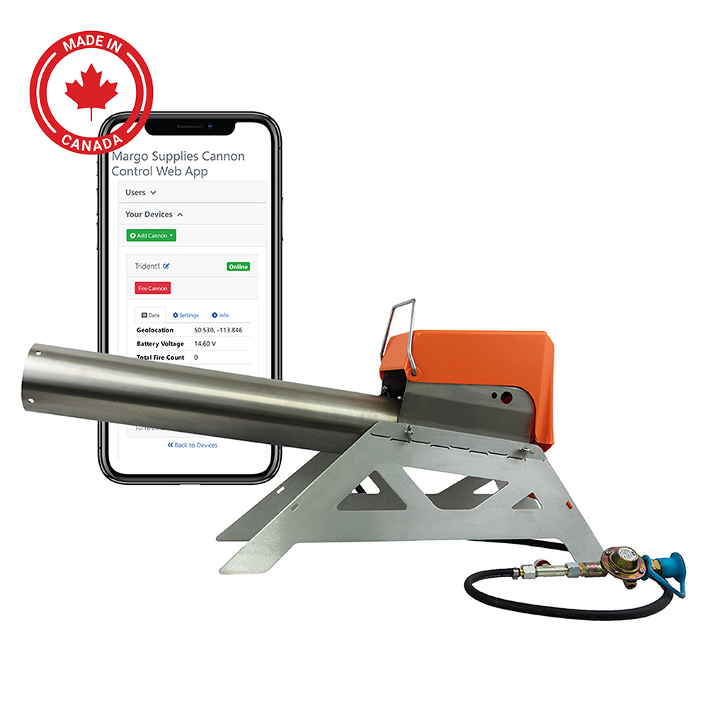Monitoree y dispare cañones de propano mediante la aplicación de Margo Supplies en cualquier zona con recepción celular (incluye 1 año de suscripción de datos).