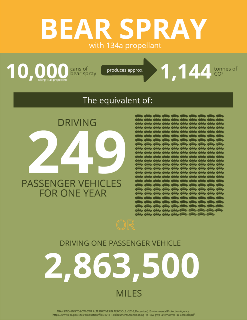 Bear Sprays that use the 134a propellant have a Greenhouse Gas Effect of 1,430x that of CO2.