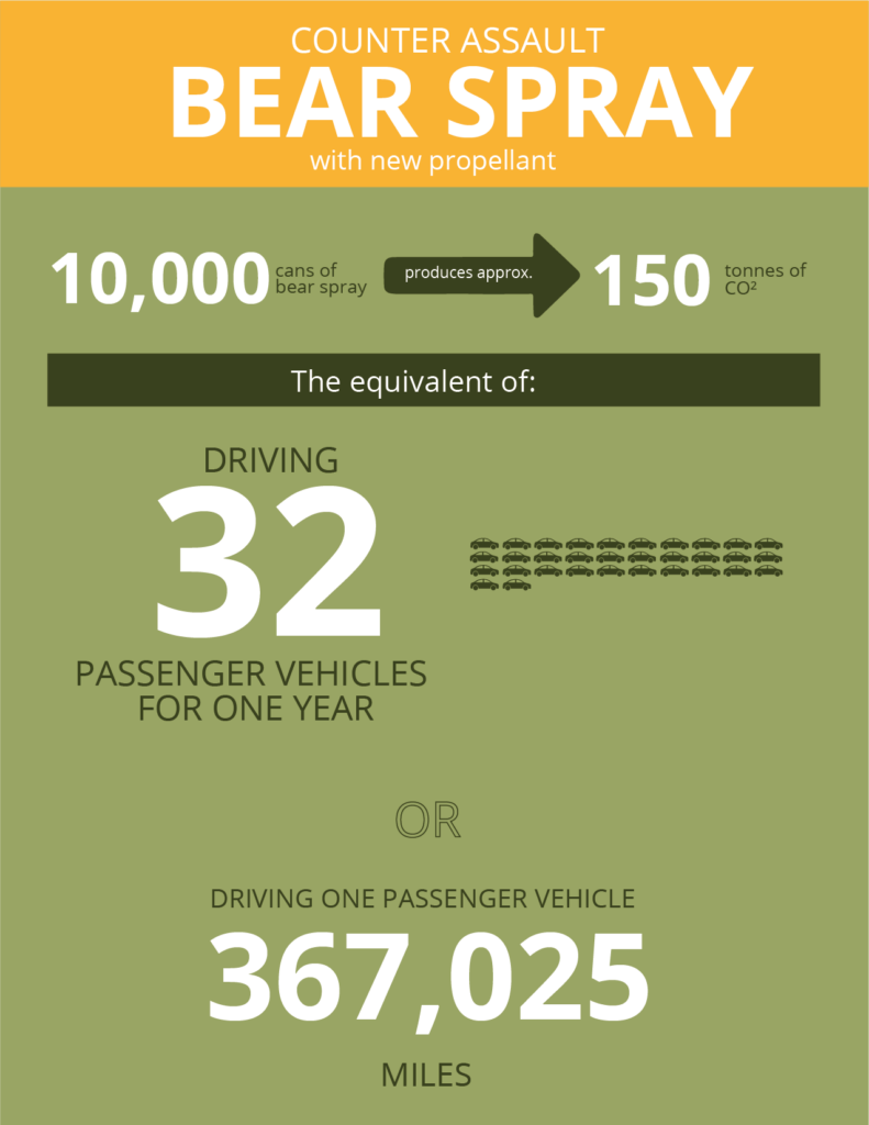 Counter Assault Bear Spray uses a new propellant that has a Greenhouse Gas Effect of 150x that of CO2.